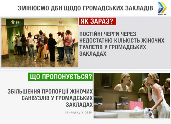 Мінрегіон пропонує збільшити кількість жіночих туалетів, які проектують у громадських закладах. Відповідні зміни хоче внести в оновлені державні будівельні норми.
