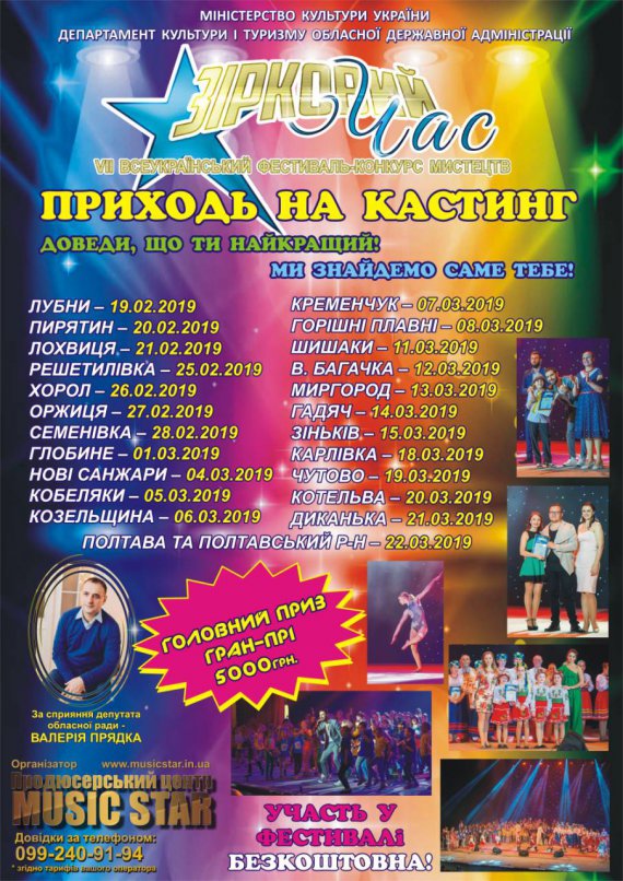 З 19 лютого по 22 березня у районах Полтавської області пройдуть відбіркові кастинги на всеукраїнський фестиваль-конкурс мистецтв "Зірковий час".