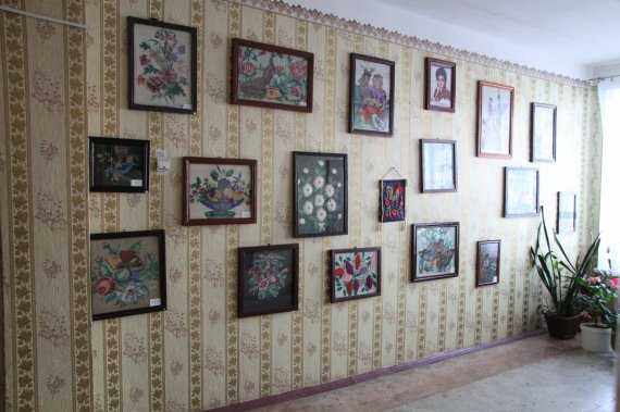 Вишивки в рамках займають стіни коридору першого поверху та сходів. Загалом тут зібрано 97 робіт. У шкільній колекції є й три пейзажі, виконані олійними фарбами. Їх також відновлювали, перш ніж виставити на огляд.