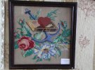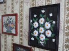 "Ці картини приніс хтось із місцевих мешканців. Знайшли на горищі. Ми випрали, відреставрували, помістили під скло. Це букети ромашок. Їхні пелюстки створені з бинтів. Тоді, в повоєнний час, було дуже важко дістати кольорові нитки для вишивки. А в людей була потреба творити. Робили картини з підручних матеріалів", - розповіла Валентина Володимирівна.
