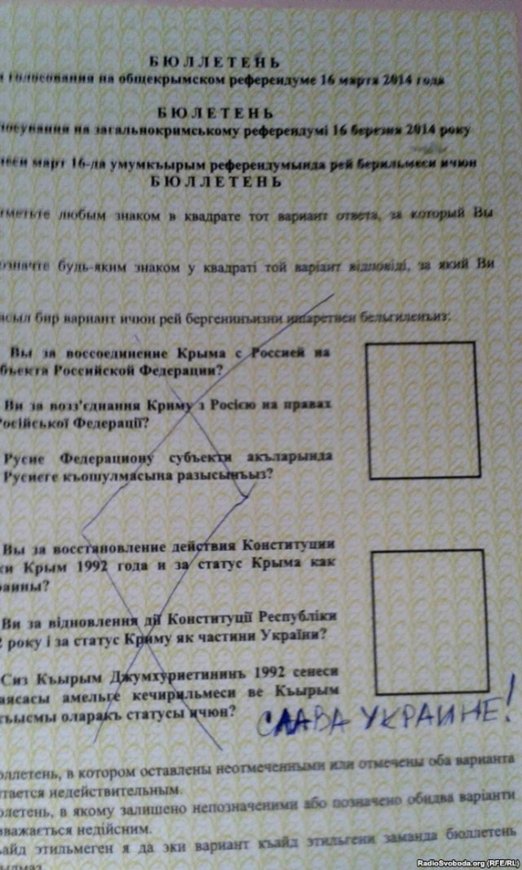 Один із таких учасників кримського "референдуму", який проголосував сьогодні зранку у Сімферополі, передав фото свого бюлетеня. Папір з такими позначками, вочевидь, буде визнаний комісією недійсним.