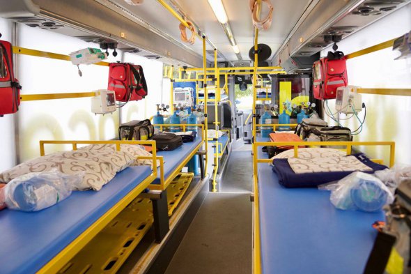 Він розповів, що автобус оснащений сучасним медичним обладнанням: інфузоматом, дихальним апаратом, ношами, дефібрилятором, монітором пацієнта, забезпечений киснем.