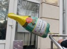 Мітингарі прив'язали до перил консульства надувну пляшку шампанського й залишили на вітрині збільшений зразок угорського закордонного паспорта.