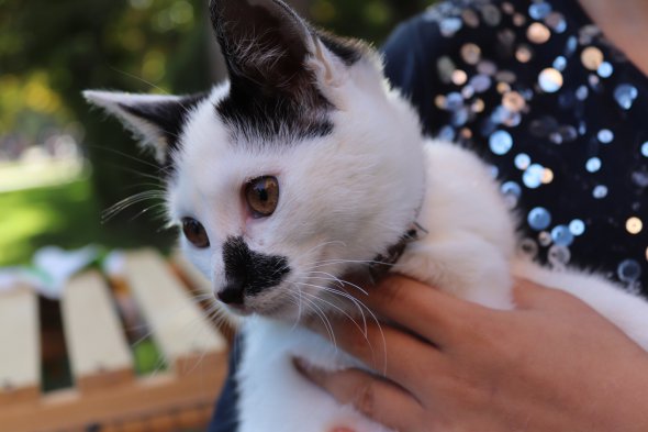 "Якісь безсовісні викинули 3-місячне котеня. Врятували його від голоду. Зараз шукаємо для нього хорошого господаря", - каже жіночка, одягнена у білий костюм. В руках тримає маленького котика, завернутого в рушник.