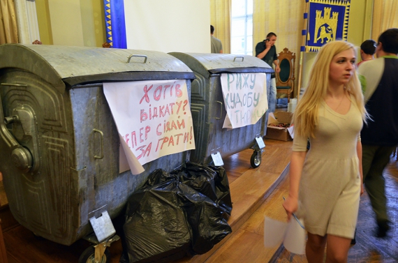 Сьогодні на позачергову сесію Львівської міськради щодо ситуації у Грибовичах активісти привезли два сміттєвих баки. За їхніми словами, смітники призначались для Львівського міського голови, який у свою чергу на сесію не прийшов. При цьому як перед входом в Ратушу так і в самій сесійній залі чергувало чимало поліції.