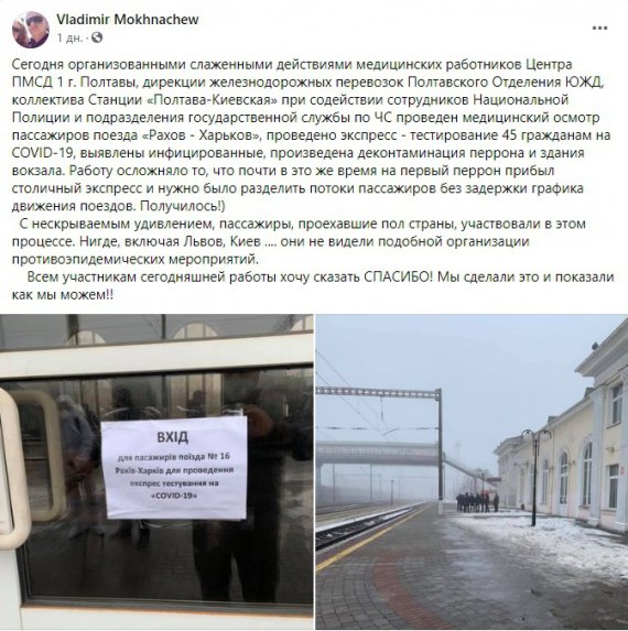 "Провели експрес-тестування 45 громадянам на Covid-19, виявили інфікованих. Провели деконтамінацію (знезараження. - Gazeta.ua) перону та будівлі вокзалу", - написав медичний чиновник.