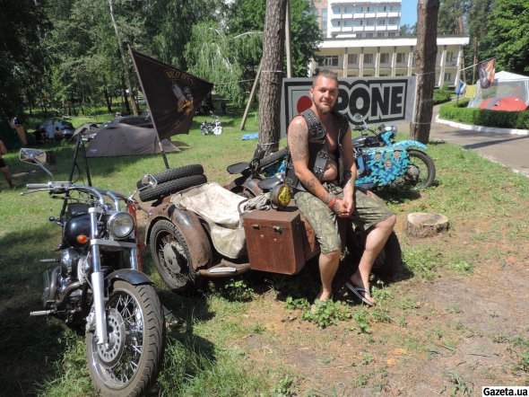 "Купив його чотири роки тому у знайомого за три тисячі, - хвалиться Дмитро Фесенко з села Рогозів Київської області. Приїхав на "тараску" вчетверте. Оселедець на поголеній голові заплів у косу. Сидить на триколісному іржавому мотоциклі 1960-го року. - Під ним жив пес, на ньому - кури, діти гралися. Рік перебирав його. Зовнішній вигляд не змінював. Зимою сіллю посипав, щоб більше іржавів. Виносив на виставки. Питають: "чи це від німців, звідки викопав?" В мене 6 байків, 8 - розібраних. Люблю їх, як дітей. Один у хаті стоїть. В дитинстві їхав велисипедом з байкерською колоною. Батьки кажуть: "Хай буде проклятий день, коли ми купили тобі "Карпати". Як збираюсь на фестиваль, руки трусяться. Це як їхати у санаторій в дитинстві. Приїду й відчуваю, що дома. З байка стільки разів падав та кидати ніколи не хотів".