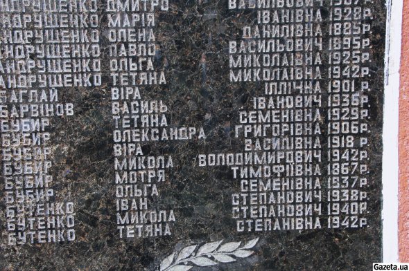 Натомість біля меморіалу в центрі села стоїть висока гранітна фігура жінки, що у скорботі схилила голову. За її спиною напівколом встановлені чорні гранітні плити. На них — імена мешканців села. Народилися в різні дати. Жили різним життям. Та об'єднані лихом: їх життя трагічно скінчилися в один день.