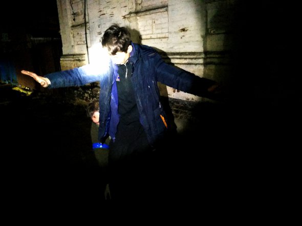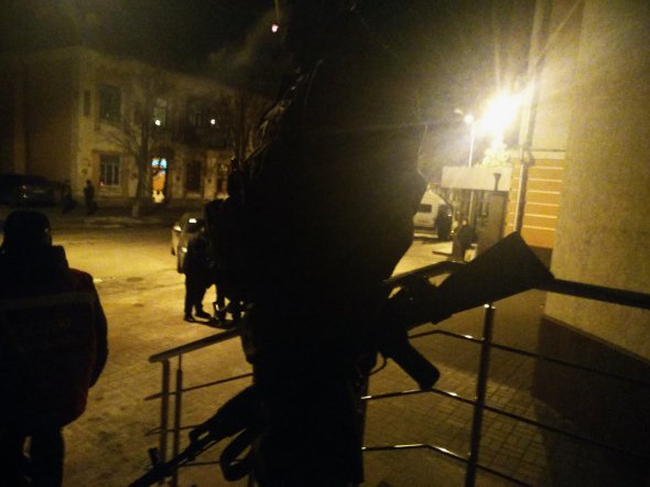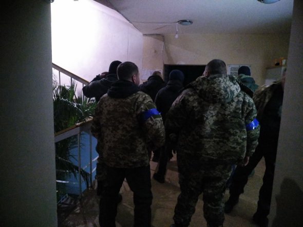 Абсолютно темна будівля біля входу має укріплення — біліють мішки з піском. Не вмикаючи ліхтарів, чоловіки піднімаються до дверей. Дмитро тихо, але чітко каже черговому пароль. Двері відчиняються й ми опиняємося в яскраво освітленому приміщенні.