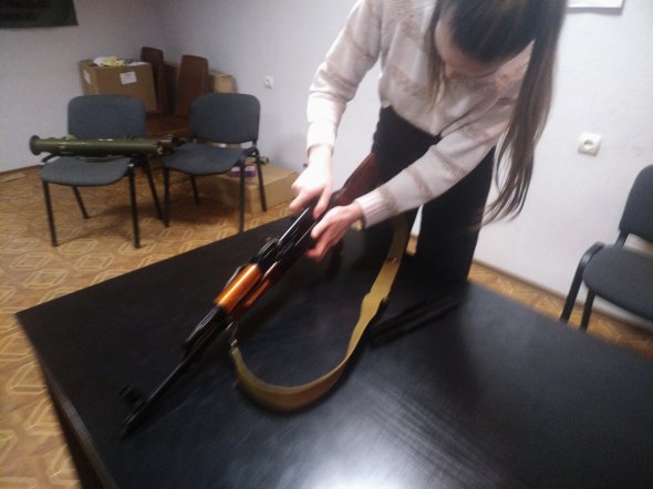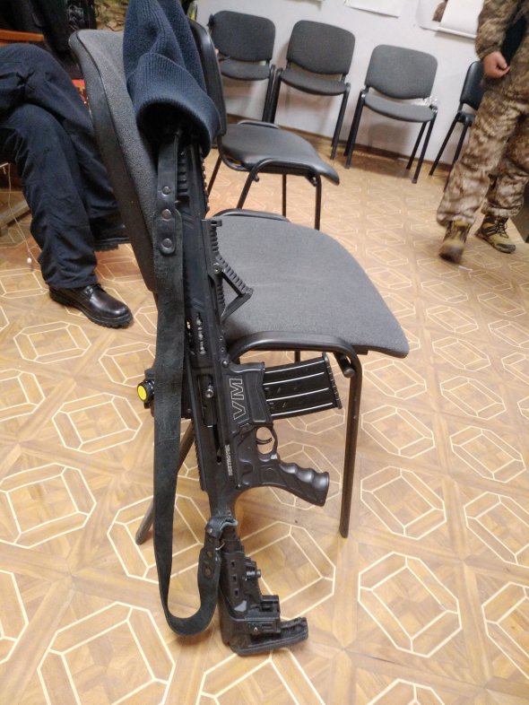 Піднімаємося сходами на поверх, звідки чути чоловічі голоси. У квадратному холі з десяток людей. За довгим столом сидять чоловіки в камуфляжі. Хтось стоїть, притулившись до стіни. Поруч зброя — автомати, мисливські гвинтівки й рушниці.