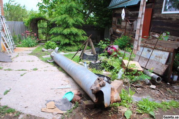 – Оце сюда нам прилетіло. Но вона пуста. Сапери її подивилися. Сказали, шо безпечна. Це таке як "Ураган". Нас в той час не було вдома – виїхали, – розповідає 62-річний Володимир Вікторович.