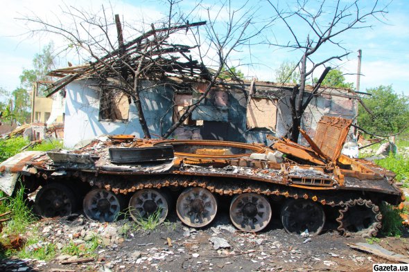 На подвір'ях чимало спалених і посічених уламками від обстрілів легковиків. За парканами – іржаві силуети знищеної російської військової техніки. Подекуди у дворах, зарослих некошеною цієї весни травою, просто неба стоять пральні машини, телевізори й газові плити. А через уламки цегли й бетону проростають і пишно квітнуть недоречно яскраві в цій розрусі різнокольорові півонії та іриси.