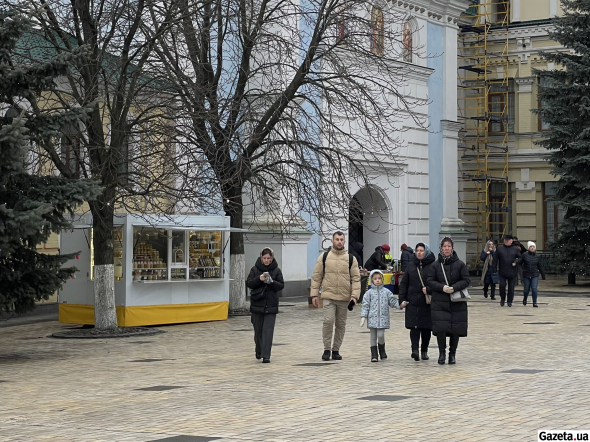 На подвір'ї біля Успенського собору чути гул розмов і привітання. Люди обмінюються теплими словами, дехто загортається в тепле пальто. Діти бігають, сміючись,і зупиняються, щоб погріти руки біля батьків.
