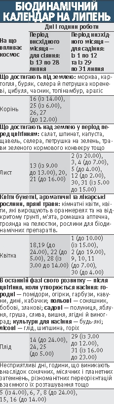 — У липні город мульчують, розпушують. Із кущів полуниці обрізають непотрібні вуса, підживлюють їх, — говорить киянка Галина Дмитрієва, 42 роки. Вона вивчає вплив космосу на рослинність. — На початку місяця висаджують картоплю, щоб мати врожай пізньої осені. Добре також закладати грядки зимової редьки, висівати кріп та шпинат.