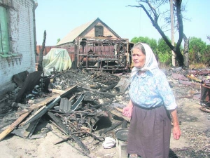 — У шалашнику зберігали все причандалля зятя, — Марія Данилівна повільно йде згарищем. У купі спалених речей лежать рештки мопеда, плуга, січкарні, будівельні матеріали, розірвані каністри. На подвір'ї стоять три вантажівки, дві дощенту вигоріли. Вікно хати забите дошками. У сусідів Одарченків закопчене горище. — А оце той стовп, від якого все занялось.