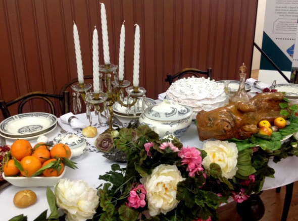 5. "Новий рік за 100 років". Історико-гастрономічна виставка в столичній галереї D12. Для виставки створили п'ять зон із інтер'єром певного часу і сервірували там новорічні столи. У першій, за 1900-й, пропонують печене порося, оселедець, пляшку вина і горілки. Страви зроблені з пластику.