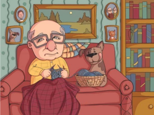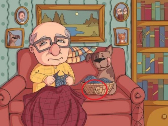 На картинці зображено спокійну сцену літнього чоловіка, який зручно розташувався на дивані в супроводі свого вірного собаки у затишній вітальні. На перший погляд усе здається звичайним, але в обстановці вміло прихований метелик. Тільки ті, у кого гострий зір і гострий фокус, зможуть знайти його всього за 7 с.