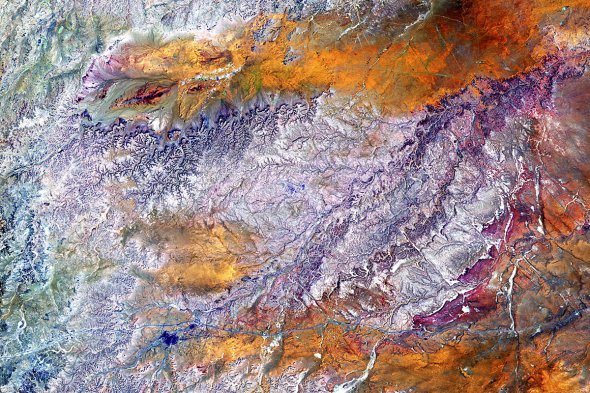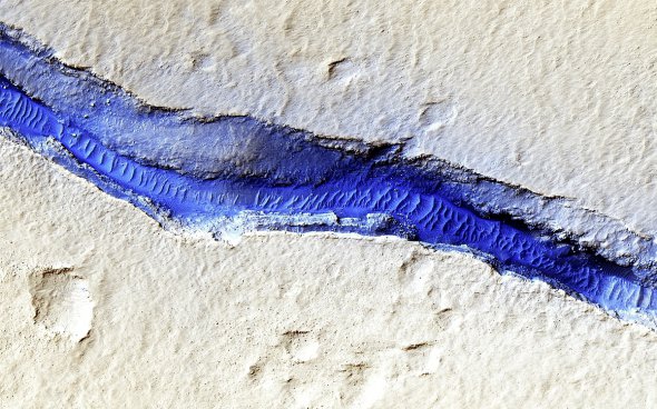 Широка блакитна річка - так звана западина Цербера, "побачена" інфрачервоною камерою HiRISE. Це система тріщин і розломів у вулканічному регіоні Елізій, а "брижі" на поверхні "річки" - піщані дюни, нанесені вітром за мільйони років.