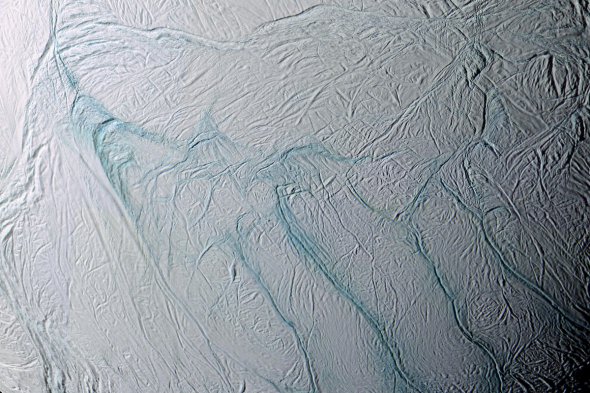 Супутник Сатурна покритий ідеально білим льодом, який викидають крижані вулкани на південному полюсі. Вважається, що вулкани "живить" підлідний океан, що покриває весь Енцелад.