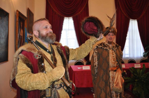 Депутат Європарламенту Ян Козловські також вбраний у тканий кожух з хутром. Брязкаючи шаблею, роздивляється скарби, які виставлені у скляних вітринах.