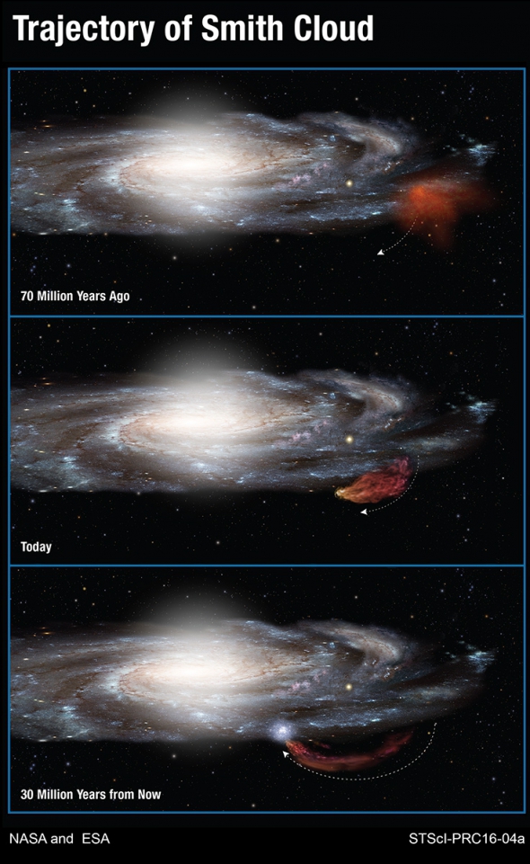 Водневу хмару відкрито ще в 1960-ті роки студенткою Гейл Сміт. Вона утворилась у зовнішніх районах галактичного диска близько 70 мільйонів років тому, "відірвалась" від нього, а тепер повертається бумерангом. Нові дані отримано за допомогою космічного телескопа Hubble.