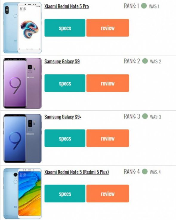 У першій трійці лідерів - два ґаджети південнокорейської компанії Samsung – Galaxy S9 та S9+.