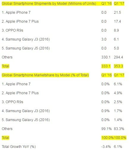 Лідером продажів став iPhone 7. З початку 2017 року продали 21,5 млн апаратів. Це 6,1% усього світового ринку.