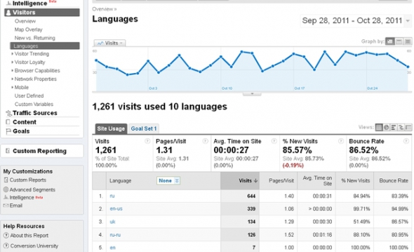 Тема сайту нібито передбачає високий відсоток україномовних відвідувачів. Але в статистиці я бачу близько 70% відвідувачів з російською мовою браузера, хоча переважна більшість із них прийшли з Києва, трохи менше з Полтави і Львова. Причина в тому, що багато україномовних відвідувачів мають російські версії браузерів. Сам неодноразово натрапляв на таке явище - людина спілкується українською, але браузер їй встановлював "знакомий камп'ютерщік", або всі компи в офісі обслуговує такий собі сісадмін (толковий взагалі-то хлопчина, але браузери поставив російські). От і виходить що, самі того не усвідомлюючи, багато україномовних інтернет-користувачів по суті відображаються в аналітиці як такі, що віддають перевагу російській.