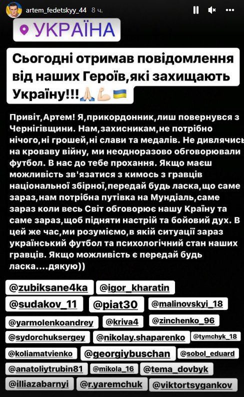 "Привіт, Артем. Я, прикордонник, лише повернувся з Чернігівщини. Нам, захисникам, не потрібно нічого, ні грошей, ні слави та медалей. Незважаючи на криваву війну, ми неодноразово обговорювали футбол.