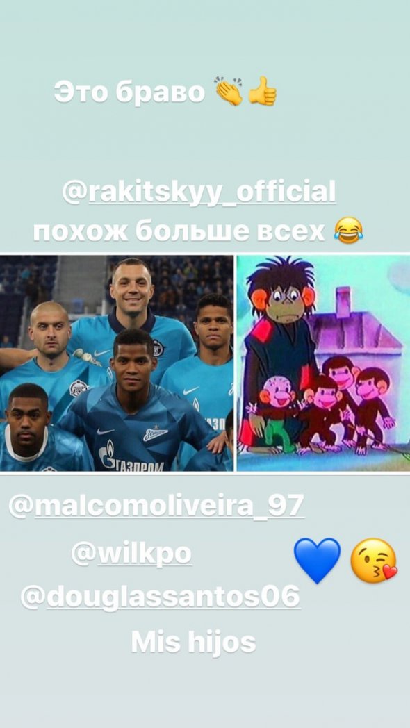 Нападник "Зеніта" поділився фотоколажем, на якому він разом з Ярославом Ракицьким та темношкірими легіонерами пітерського клубу позують перед матчем. Поруч із фото був мультиплікаційний кадр із мавпами.