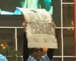 На ньому було написано "Спочивай з миром, Фергі (RIP, Fergie)". Плакат був адресований шотландському наставникові "Манчестер Юнайтед" Алексу Фергюсону. Тевес демонстрував його оточуючим під час туру команди на відкритому автобусі по місту, який пройшов увечері в понеділок, 14 травня.