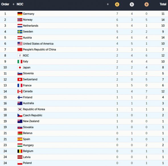 У медальному заліку лідерство продовжує утримувати Німеччина, на рахунку якої вже сім золотих нагород. Норвегія відстає на одне "золото". По п'ять медалей вищого ґатунку мають Нідерланди та Швеція.