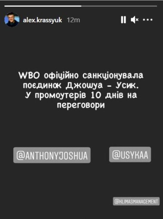 "WBO офіційно санкціонувала поєдинок Джошуа-Усик", - написав Красюк.