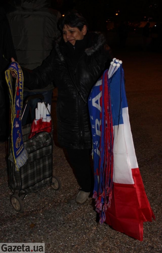 "Ми із Сербії. Успіху Україні у матчі. Беріть прапори по п'ять євро", - сказала одна з жінок. В офіційних точках продажу атрибутики ціни аналогічні.