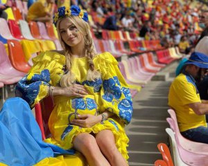Для чергового "виходу" на трибуни дівчина вибрала розкішну вишиту міні-сукню жовтого кольору з блакитними вишитими квітами. На її голові був синьо-жовтий віночок із квітів, а волосся заплетене в дві косички. Образ завершували коричневі черевики-ковбойки, прикраси на руках і синьо-жовтий прапор на щоці. Поруч з нею лежав синьо-жовтий прапор. Повідомляє 24tv.ua