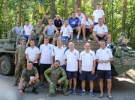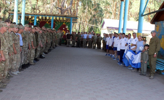 Перед грою динамівці відвідали бійців АТО і порадували хлопців подарунками - командиру полку Олегу Нечаєву був вручений повний комплект новенької форми збірної України, з написом АТО на грудях, м'яч з автографами і прапор "Динамо". На останньому футболісти залишили свої підписи та побажання.