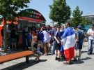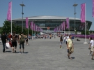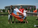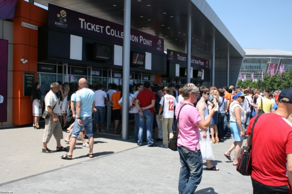 У ларьків з атрибутикою Євро-2012 черга не припиняється, хоча ціни не маленькі. Футболки, наприклад - 200-250 грн, м'яч "Танго" - 1300 грн. Вода і пиво теж розлітаються. Бокал пива 0,5 л - 16 грн, півлітрова кола - 14 грн.