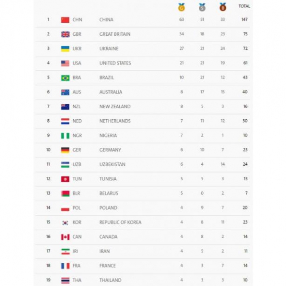 Лідерство у загальному заліку утримує Китай, який завоював 147 медалей (63 - золоті, 51 - срібну та 33 - бронзові). На другому місці Велика Британія (75 медалей, 34 - золоті). Третю позицію утримує збірна України, яка має у своєму активі 72 медалі - 27 золотих, 21 - срібну і 24 - бронзові.