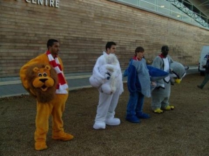 Андрій Аршавін був одягнений в костюм синьо-біло-блакитної акули. Сеск був зайчиком, Тео, як англієць, грав лева. Бакарі Саньї дісталася роль сови.