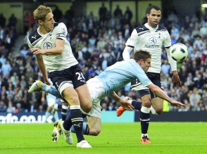 Найбагатший клуб світу — англійський "Манчестер Сіті" — уперше в історії зіграє в Лізі чемпіонів. Вівторкова домашня перемога підопічних Роберто Манчіні над "Тоттенхемом" (1:0) забезпечила їм четверту позицію, яка дає право на участь у четвертому кваліфікаційному раунді головного євротурніру. На фото півзахисник "МС" Джеймс Мілнер (у центрі) протистоїть оборонцеві "Тоттенхема" Майклові Доусону (ліворуч) та опорнику Сандро.