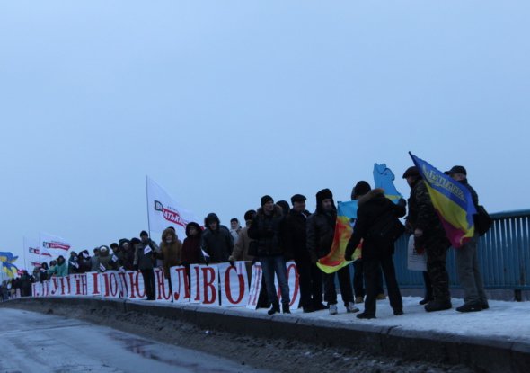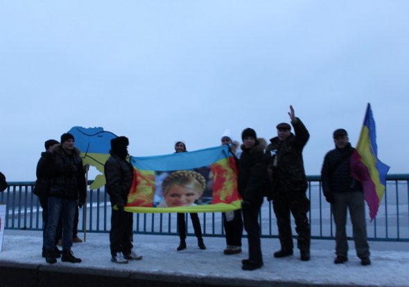 З 8-ї ранку учасники акції вишукалися на мосту над Дніпром, тримаючи у руках величезні літери "Юлі - волю! Україні - волю!", державні прапори та партійну символіку.