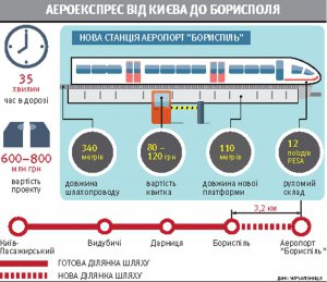 У Борисполі проляже 3,2 км залізниці. Над трасою Київ — Харків до неї приєднають 340-метрову одноколійну залізничну естакаду. Від вокзалу Київ-Пасажирський до терміналу "Д" аеропорту потяг доїжджатиме за 35 хв. Вартість проекту становитиме 600–800 млн грн.