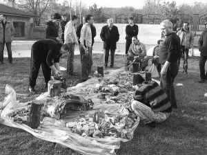 Чоловіки ріжуть баранів зі словами "Бісмілляхy", що означає "в ім'я Аллаха". Кров спускають. М'ясо рубають на невеликі шматки. Священник — імам — стежить, аби кістки не були великі. Просить розрубати на менші, щоби було зручніше готувати. Складають шматки по 1,5–2 кг у пакети і розкладають на застеленій поліетиленом траві.