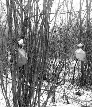 Прикордонники вирішили, що тварина відчула запах порушника-контрабандиста. Однак за мить помітили на кущах і деревах шість поліетиленових мішків. Вони були прив"язані шнурками до стовбурів і гілок на висоті з метр.