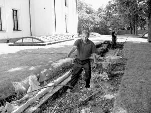 Біля музею на газоні троє чоловіків копають траншею завглибшки півметра. Добираються до гідроізоляції. У канаві видно колодязі для стікання дощової води з даху. Мокру землю двоє робітників накидають на тачку. Третій возить через дорогу метрів за 10. Трохи далі розкладені латки газону.