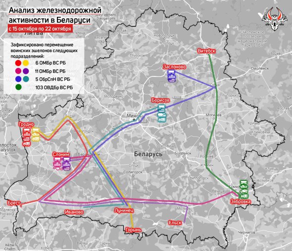 "Окремо варто згадати про пересування ЗС РФ залізницею на полігони: 230 загальновійськовий полігон "Обуз-Ліснівський" (Барановичський район), полігон "Лепельський" 19 ОМБр (Лепельський район), полігон "Лосвідо" 103 ОВДБр (Вітебський район). Але зараз перекидання військ ще триває", – вказали у групі.