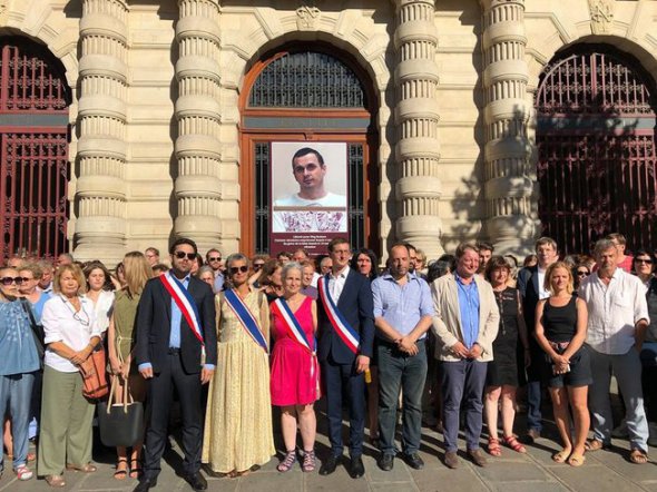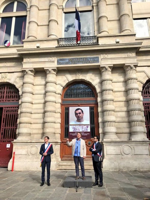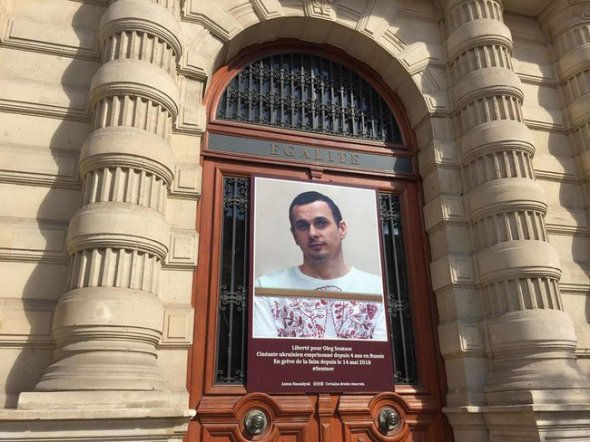 Мер Парижа Анн Ідальго в підтримку політв'язня Олега Сенцова, ув'язненого в РФ, розмістив фотографію режисера на фасаді ратуші 4-го округу.