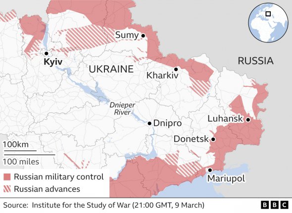 Тим часом, незграбна російська військова колона, яка кілька днів стояла на околиці Києва, розсіюється і передислокується, згідно з супутниковими знімками, зробленими в четвер. Помічено, що частина техніки з конвою перемістили приблизно на відстань 32 км від столиці. Артилерію поставили на вогневі позиції. Велика Британія попередила, що Росія може намагатись передислокувати війська для нападу на Київ.