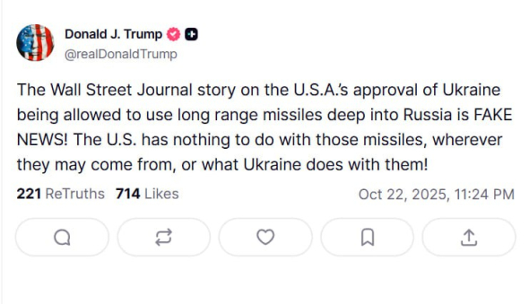 "Історія The Wall Street Journal про нібито дозвіл США Україні використовувати далекобійні ракети для ударів у глиб Росії - фейкова новина! США не мають жодного стосунку до цих ракет - звідки б вони не надійшли й що б Україна з ними не робила!", - заявив Трамп в Truth Social.