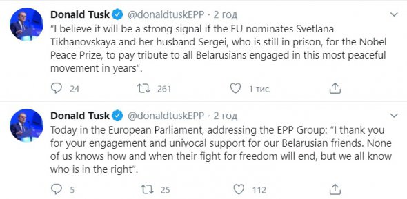 "Я вважаю, що це буде сильним сигналом, якщо ЄС висуне Світлану Тихановську та її чоловіка Сергія, який досі перебуває у в'язниці, на Нобелівську премію миру, щоб віддати належне всім білорусам, які беруть участь у цьому найбільш мирному русі за останні роки", - наголосив Туск.